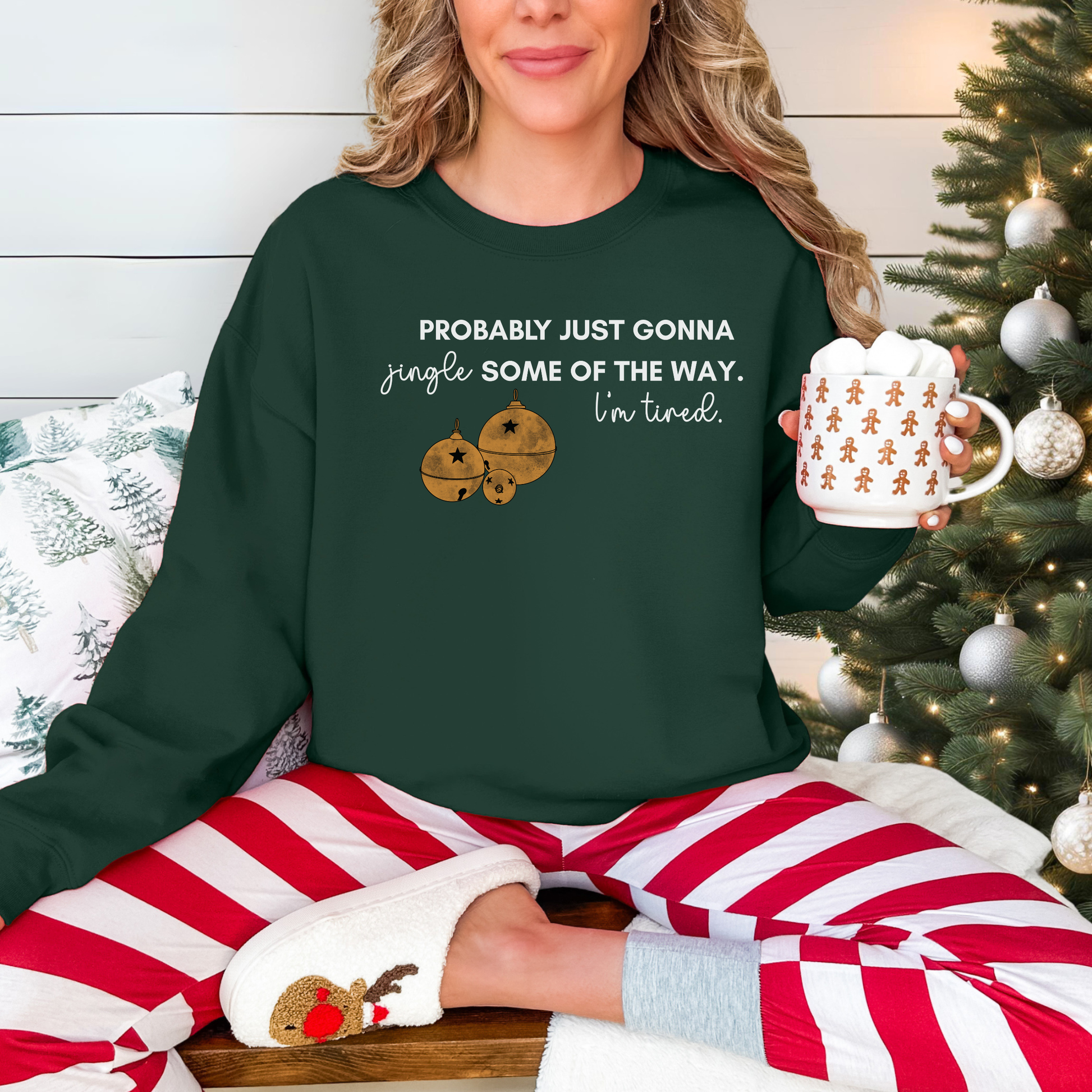 Cozy and festive crewneck sweatshirt featuring the phrase 'Probably just gonna jingle some of the way I'm tired' with a Christmas bell. Perfect for those looking for a comfortable and holiday-inspired piece to wear during the festive season. Ideal for adults celebrating Christmas and looking for a fun and cozy addition to their wardrobe.