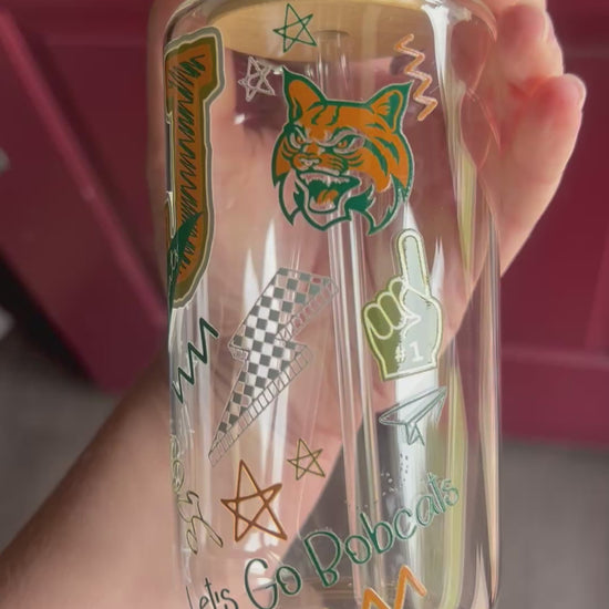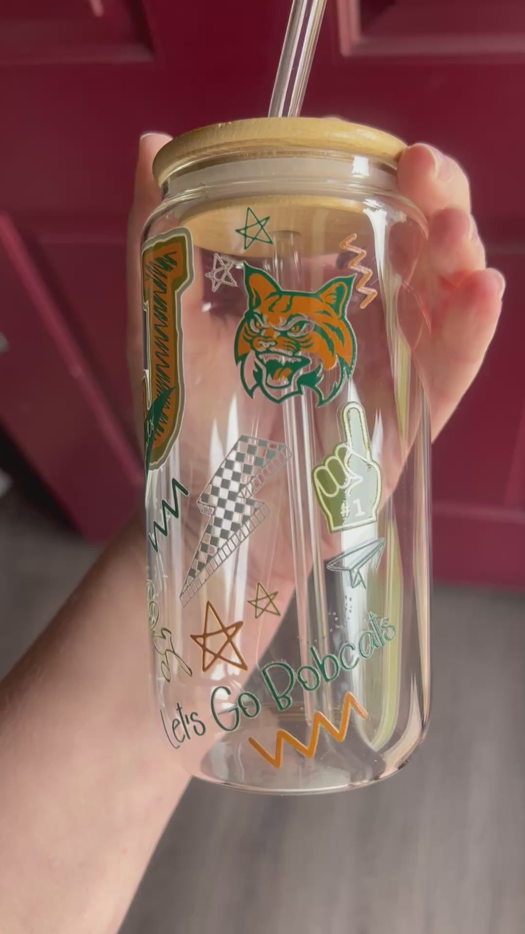 Jenkins School Spirit Glass Can with a Glass Straw and Bamboo Lid and Straw Cleaner