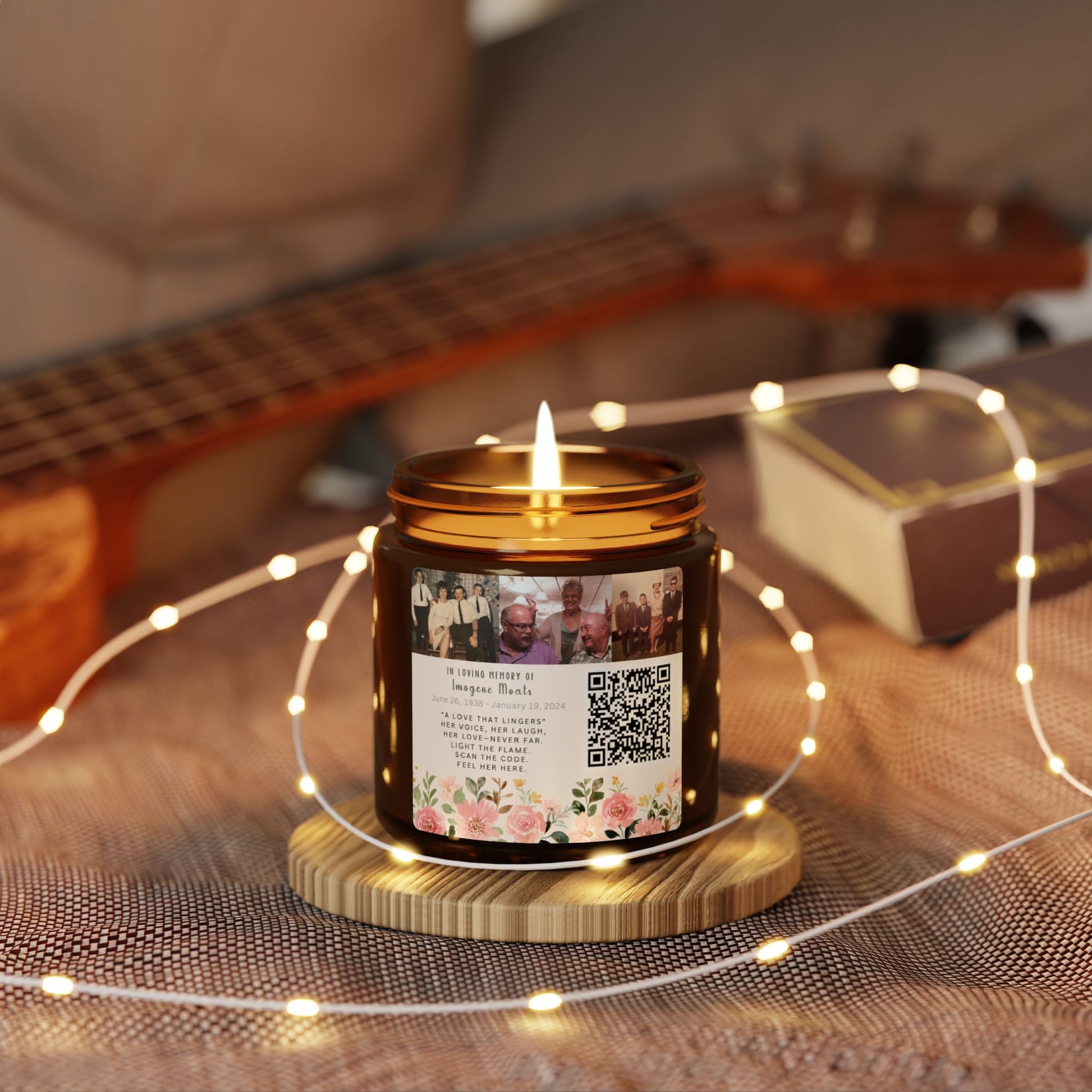Honor a cherished memory with our personalized memorial soy candle, thoughtfully crafted to provide comfort, warmth, and connection during times of remembrance. Each candle is custom-made with a photo(s) of your loved one, their handwriting if you wish and includes a scannable QR code that links to a treasured video or voicemail message—keeping their voice or memory close, always. Hand-poured using 100% natural soy wax, this clean-burning candle is presented in a beautiful, reusable glass jar—a lasting keepsake that continues to hold meaning long after the candle has burned. With calming scent options and a soft, flickering glow, this candle creates a serene atmosphere for reflection and remembrance. Whether used during quiet moments of grief, on a special anniversary, or given as a sympathy gift to someone mourning a loss, this candle offers a deeply personal way to keep their memory alive.