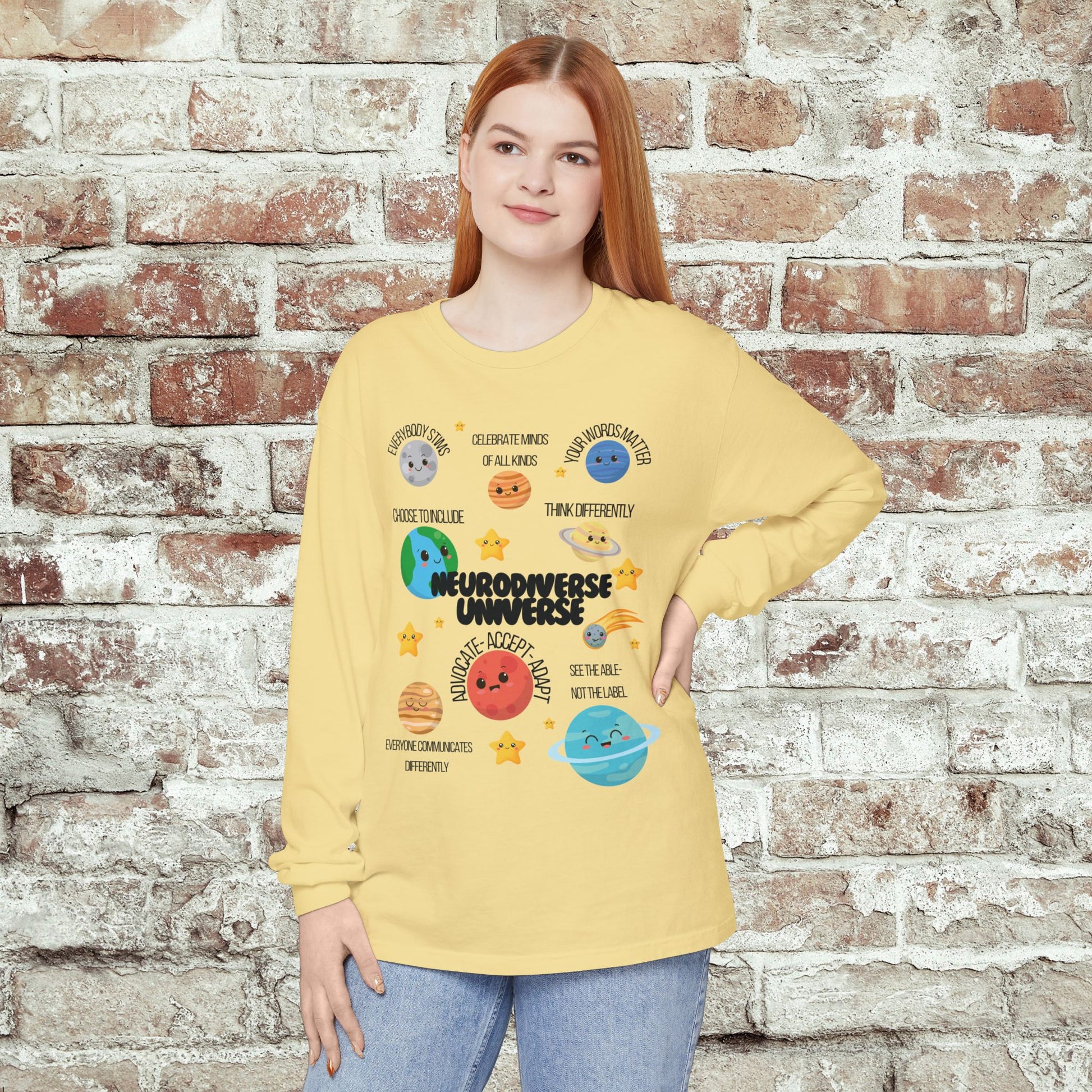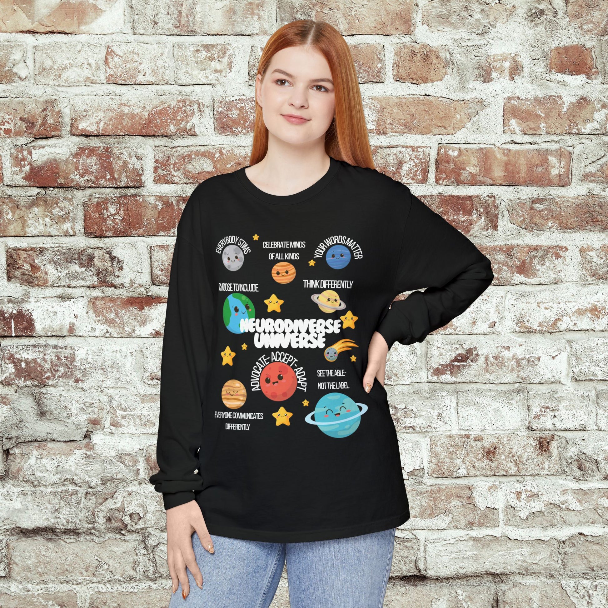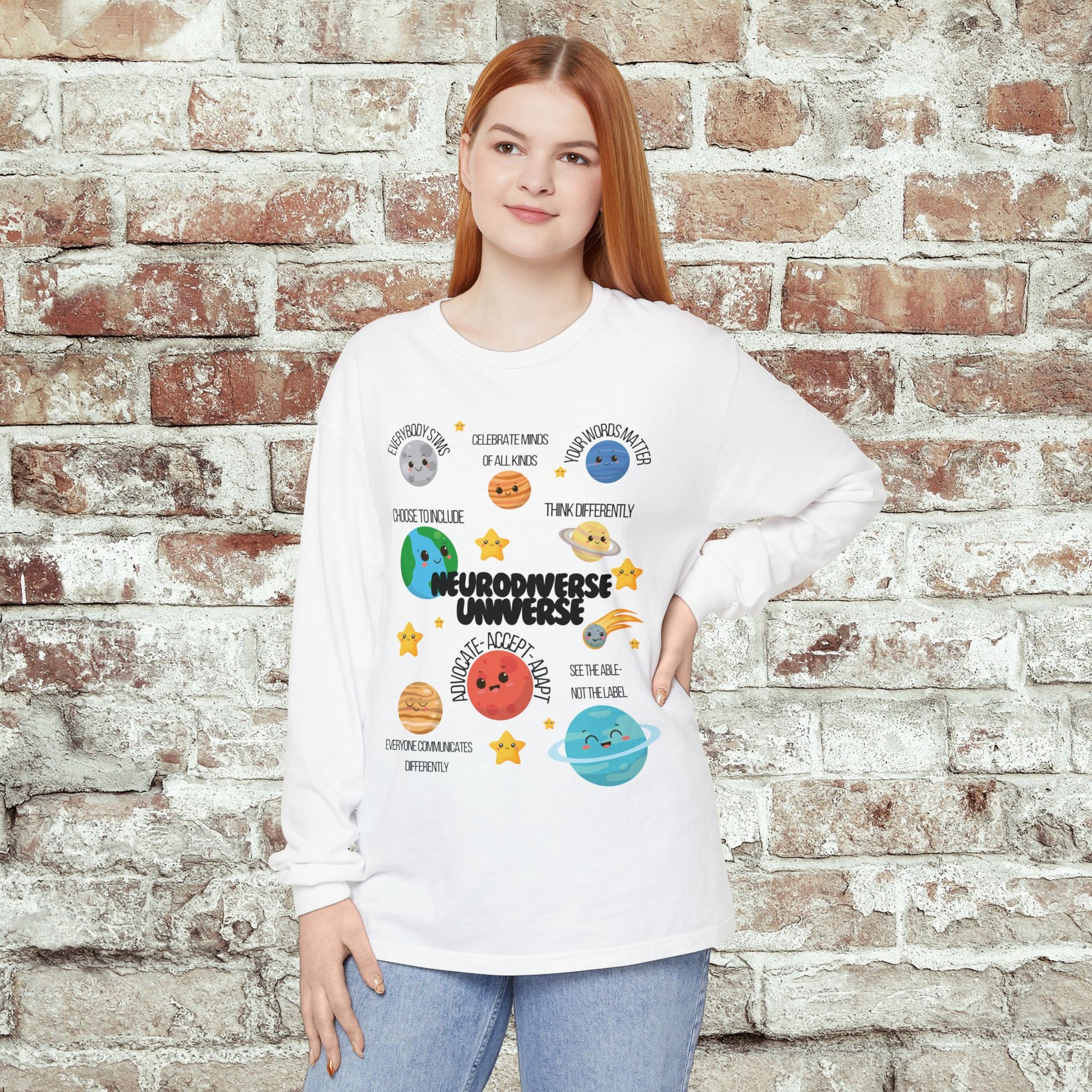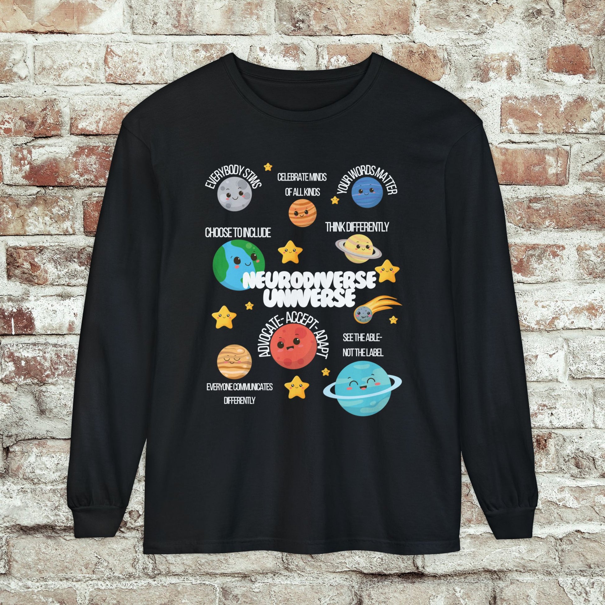 🌟 Neurodiverse Universe Tee – Where Every Mind Belongs! Celebrate the beauty of different brains with our unisex long-sleeve tee with this adorable, inclusive design featuring our solar system’s cutest planets and powerful affirmations. Perfect for spreading awareness, advocating for inclusion, and starting meaningful conversations.