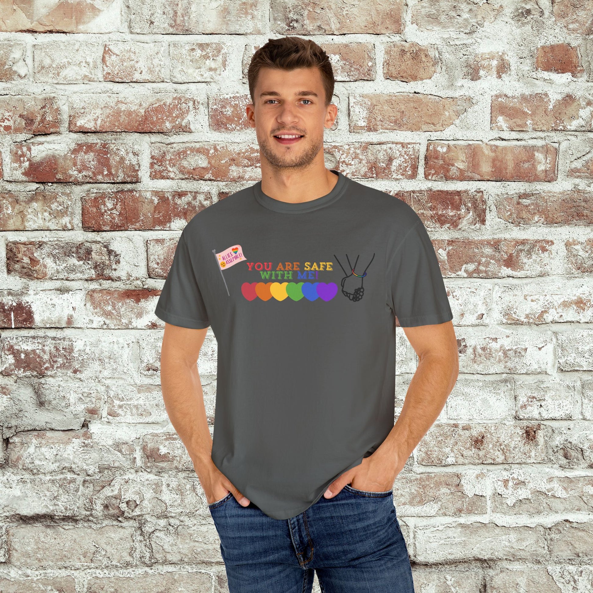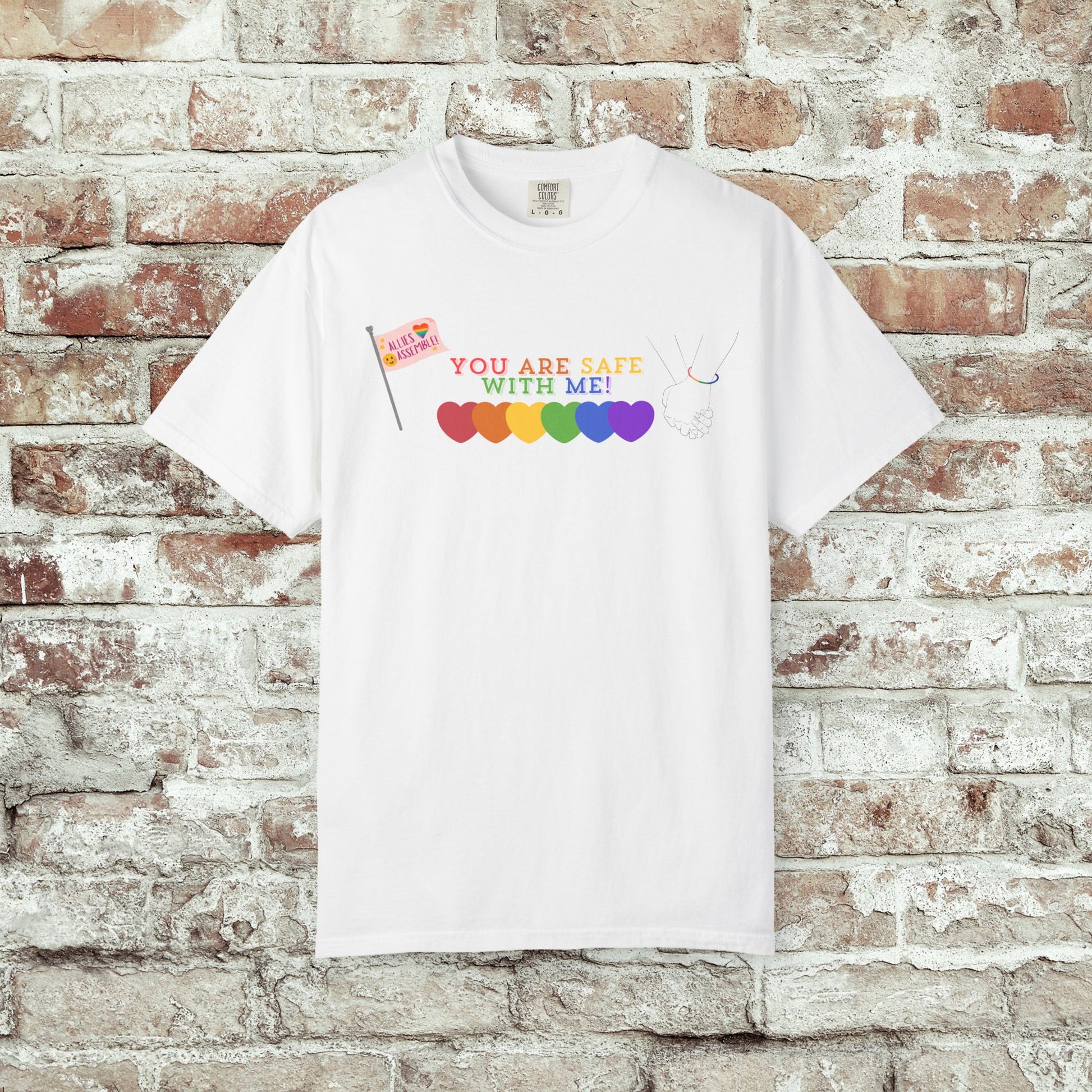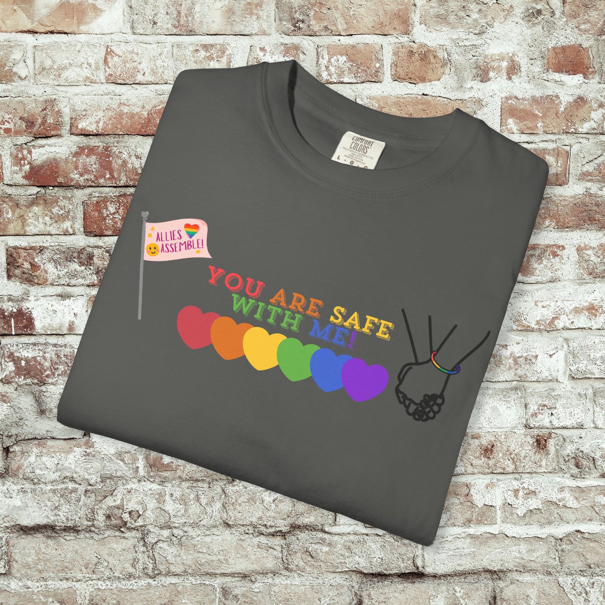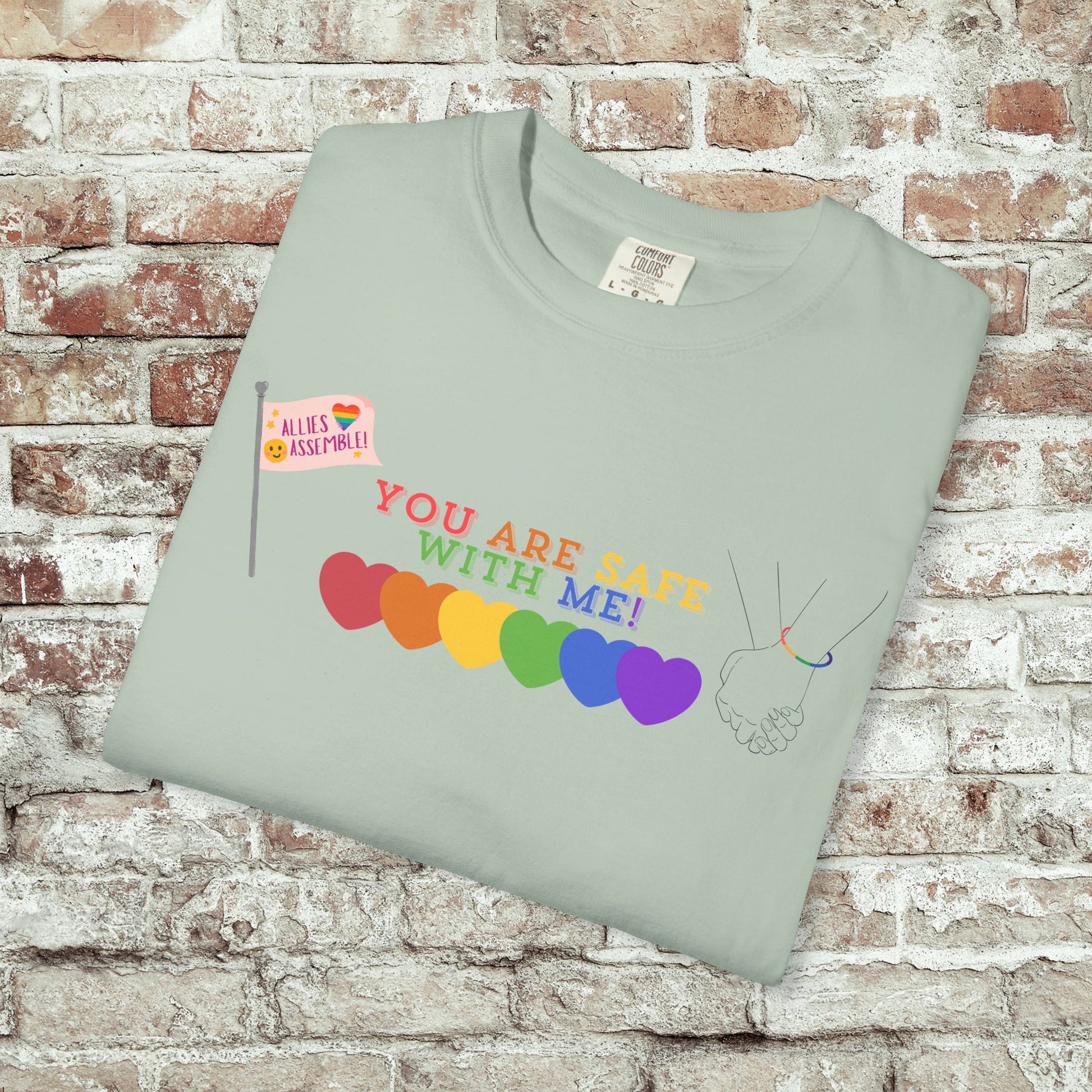 You Are Safe With Me Ally Pride Shirt | LGBTQ+ Support Tee | Rainbow Hearts T-Shirt | Inclusive Safe Space Shirt | Allies Assemble Tee